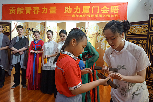 为了在校园传统文化节上介绍闽南传统文化南音,5月7日,思明区莲前小学师生慕名前往南音阁采风欣赏我团南音公益性惠民演出。我团组织演出人员同师生们进行互动。首次接触南音的孩子们兴奋不已,他们认真观看了表演,体验打击乐和学习南音的闽南语念唱,还饶有兴致地向演出人员提问各种问题。